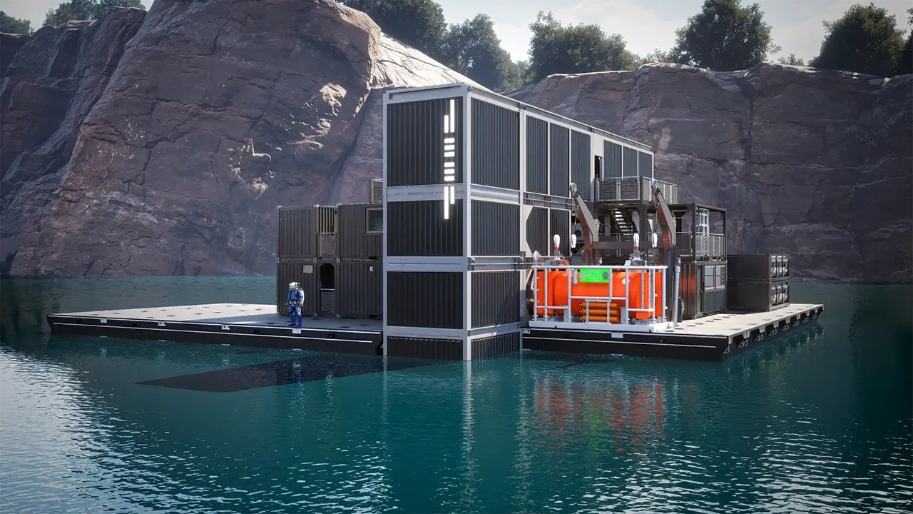 Complete brand design system spanning physical and digital products. UX/UI for website and app with 3D animations. Internal dive sign alphabet for technical dive teams. Liveries for submarines and habitats. Mission patches, uniforms, expedition maps. Communications design system. Sustainability program materials. Operational design across campus architecture, interiors, pitch materials, and meeting frameworks.