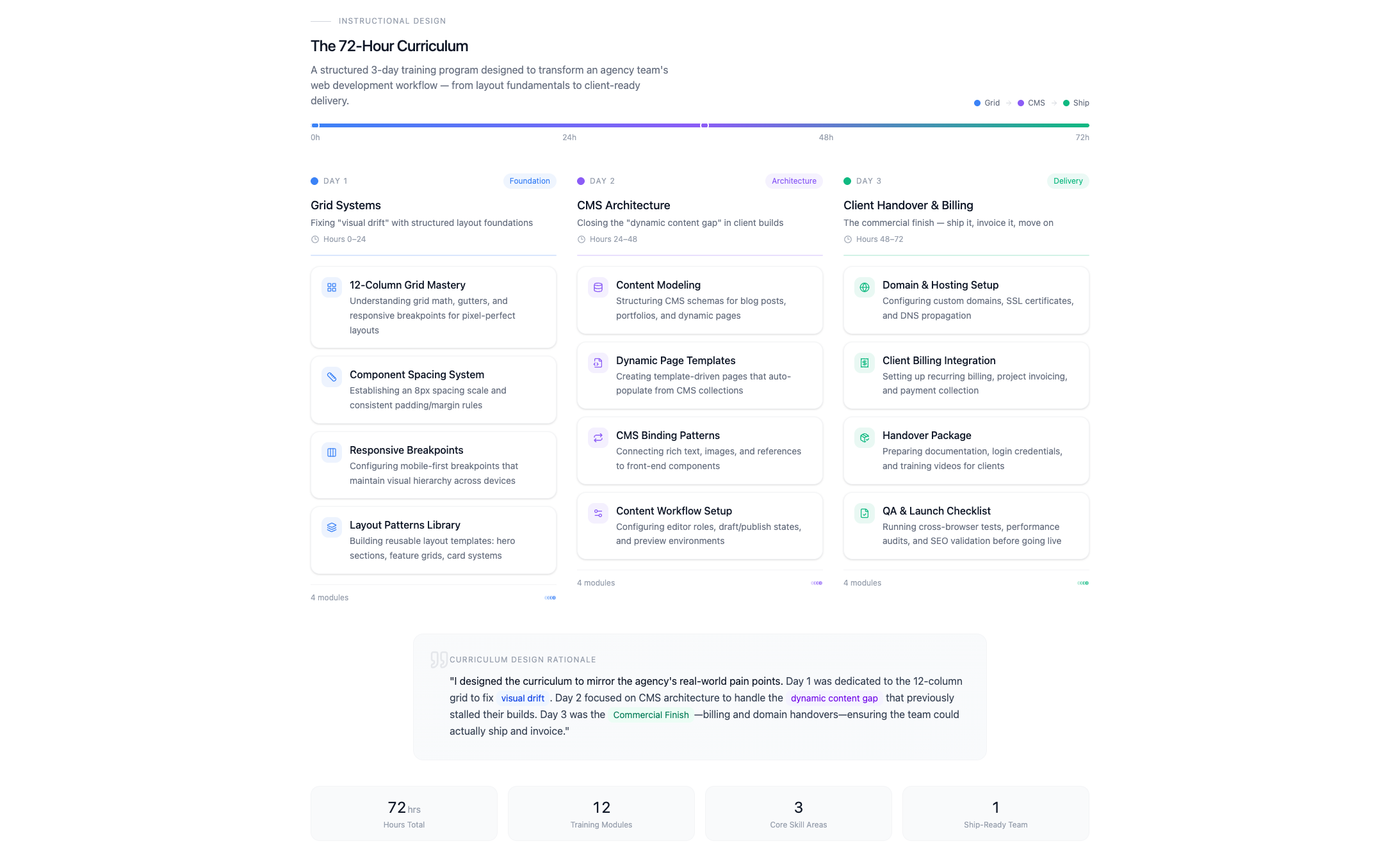 Day three introduced client handover: billing, domain management, permissions, and the practicalities of launching and maintaining sites for paying clients.